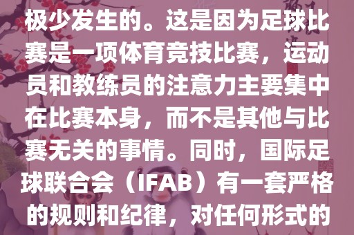 在世界杯足球比赛中,打架事件极为罕见。这是因为足球比赛的核心是竞技,运动员和教练员的关注点在比赛本身,而非其他杂事。国际足球联合会实施严格的规则和纪律,对暴力行为采取零容忍政策,并会进行严厉处罚。这使得足球比赛保持公正、公平的环境。