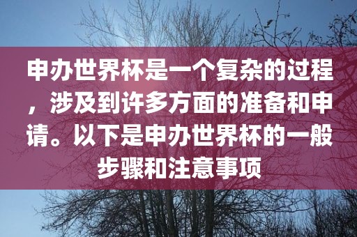 申办世界杯是一个复杂的过程,涉及到许多方面的准备和申请。以下是申办世界杯的一般步骤和注意事项