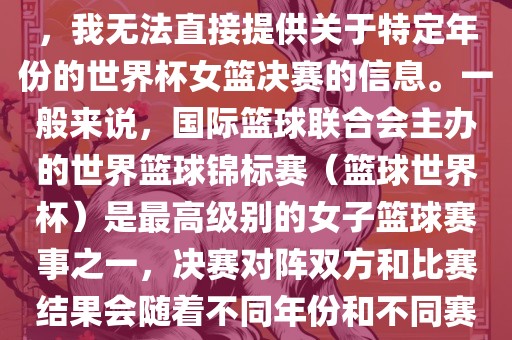 由于女子篮球赛事体系的不同,我无法直接提供关于特定年份的世界杯女篮决赛的信息。一般来说,国际篮球联合会主办的世界篮球锦标赛(篮球世界杯)是最高级别的女子篮球赛事之一,决赛对阵双方和比赛结果会随着不同年份和不同赛事版本而有所变化。