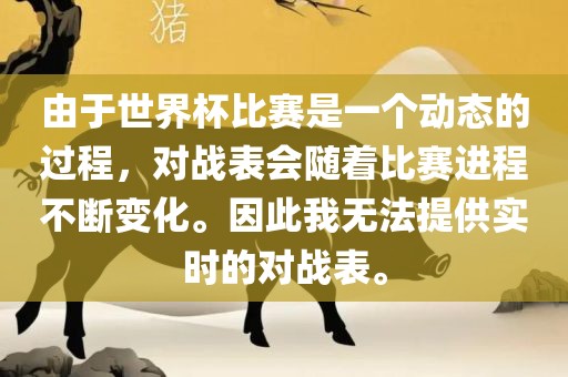 摘要:由于世界杯比赛是一个动态的过程,对战表会随着比赛进程不断变化,因此无法提供实时的对战表。需要关注比赛进程以获取最新的对战信息。