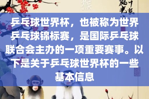 乒乓球世界杯,也被称为世界乒乓球锦标赛,是国际乒乓球联合会主办的一项重要赛事。以下是关于乒乓球世界杯的一些基本信息