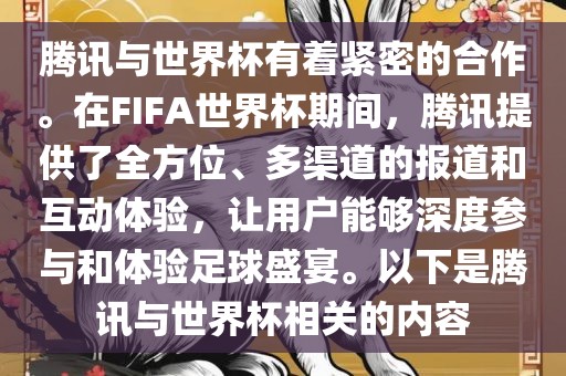 腾讯与世界杯有着紧密的合作。在FIFA世界杯期间,腾讯提供了全方位、多渠道的报道和互动体验,让用户能够深度参与和体验足球盛宴。以下是腾讯与世界杯相关的内容